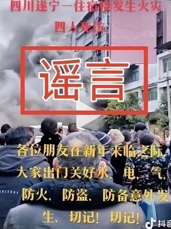 2月4日8時許,一則標題爲“四川遂寧一住宿樓發生火災,4人死傷”的短視頻在網絡傳播,引發網友關注。對此,遂寧消防回應:消息不實,系謠言!
