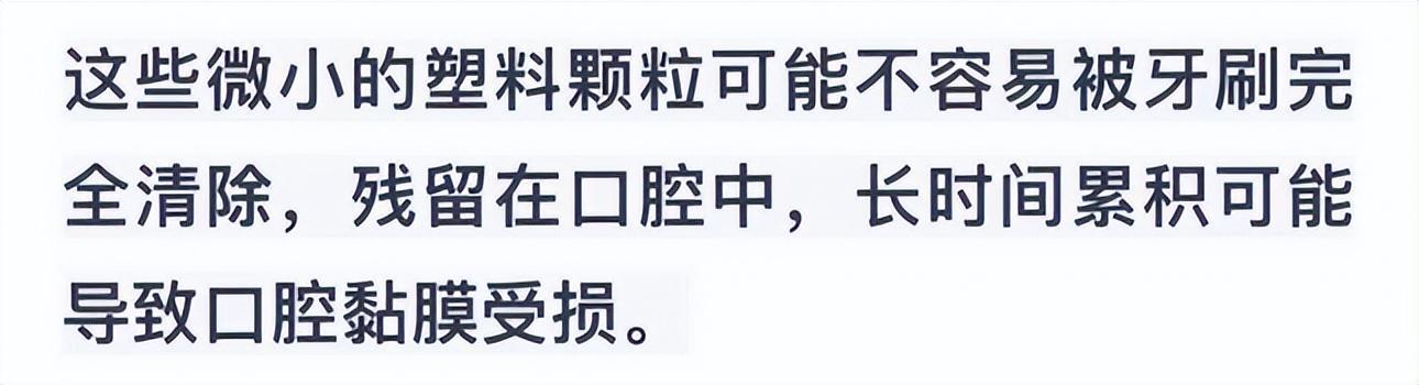 牙膏中的微塑料會導致口腔黏膜受損?目前並沒有明確的科學證據表明牙膏中的微塑料通過長時間累積會導致口腔黏膜受損。我們還可以換個角度考慮,我們咀嚼時,大大小小食物顆粒在我們口腔中不斷摩擦,都不會磨損口腔黏膜,那牙膏中的微塑料就更微不足道了。