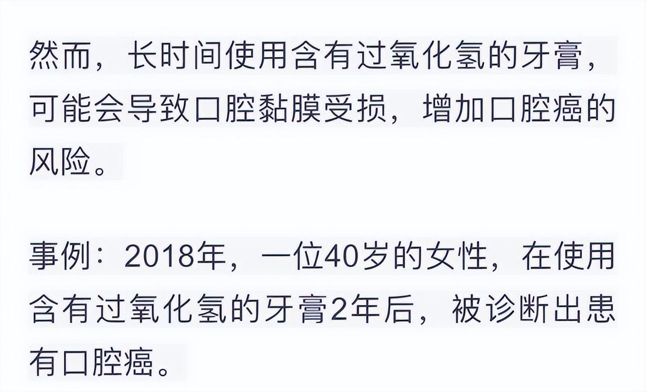 一項2022年的研究系統評估了用於牙齒漂白的過氧化氫,是否對口腔黏膜具有致癌效應,結果表明,牙膏中的過氧化氫根本不會對口腔黏膜產生致癌效應。