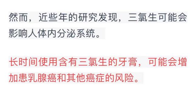 儘管一些研究表明三氯生可能對健康產生負面影響,但目前還沒有明確的證據表明含有三氯生的牙膏會致癌。