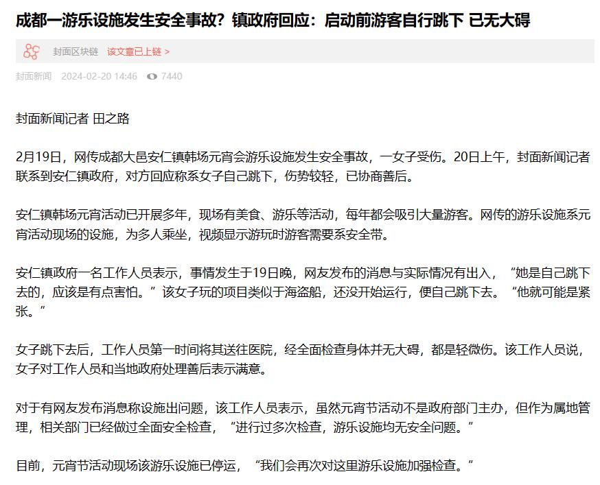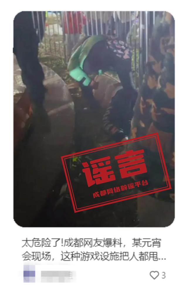 網傳“成都一遊樂設施發生安全事故”?鎮政府回應:系遊客自行跳下受輕微傷
