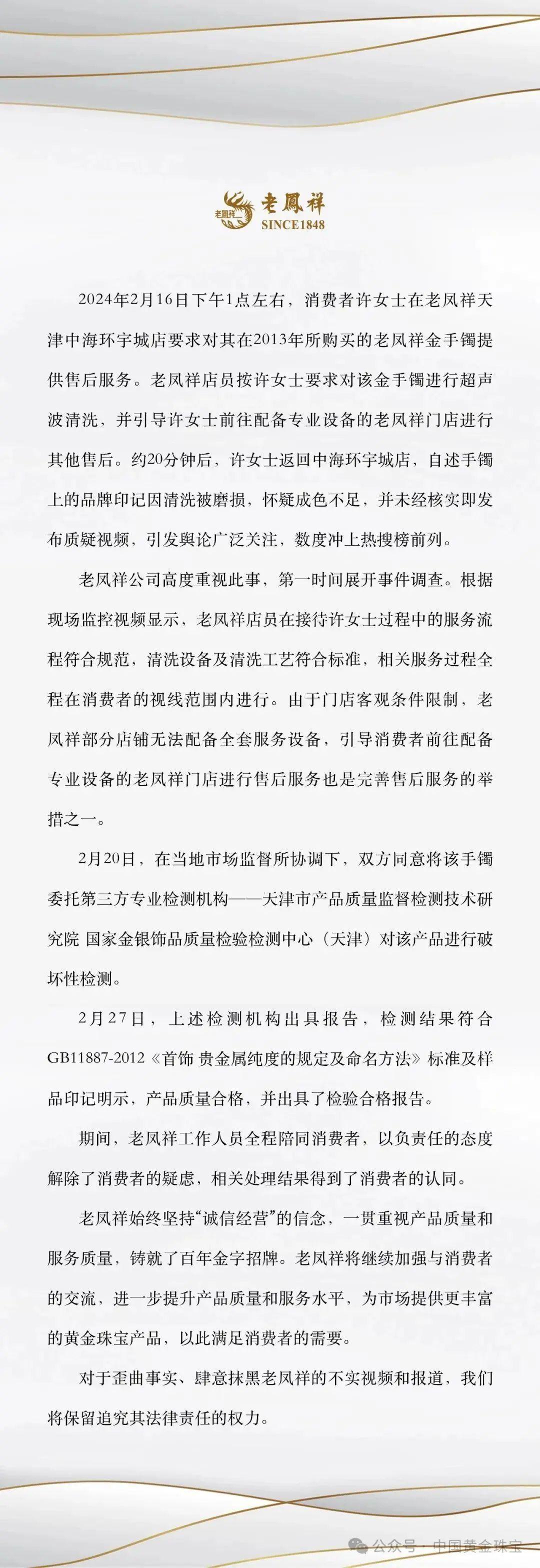 日前,“老鳳祥被指清洗手鐲故意蹭掉logo”一事在網絡上引發熱議。事件起因是天津一消費者發視頻稱,自己去“老鳳祥”清洗黃金手鐲後,手鐲上的品牌印記因清洗被磨損,進而懷疑手鐲成色不足。2月27日,由天津市產品質量監督檢測技術研究院國家金銀飾品質量檢驗檢測中心(天津)出具的該黃金手鐲的質量檢測報告正式出爐。檢測結果顯示:該商品質量合格,不存在黃金含量不足等問題。。清洗手鐲引發爭議?送檢!老鳳祥全程還原了本次事件的經過。2024年2月16日下午1點左右,消費者許女士來到老鳳祥天津中海環宇城店,要求對其在2013年所購買的老鳳祥金手鐲提供售後服務。店員根據其要求對該金手鐲進行超聲波清洗,並引導許女士前往配備專業設備的老鳳祥門店進行其他售後。約20分鐘後,許女士返回中海環宇城店,自述手鐲上的品牌印記因清洗被磨損,懷疑成色不足,並未經覈實即發佈質疑視頻,這一視頻,在網絡上迅速發酵。事件發生後,老鳳祥公司高度重視,第一時間展開事件調查。根據現場監控視頻,老鳳祥店員在接待許女士過程中的服務流程符合規範,清洗設備及清洗工藝符合標準,相關服務過程全程在消費者的視線範圍內進行。同時,清洗前後,該首飾的稱重克數完全一致,老鳳祥店方不存在磨損印記的動機、行爲和可能。此外,受限於門店客觀條件因素,部分店鋪無法配備全套服務設備,故引導消費者前往配備專業設備的老鳳祥門店進行售後服務,也是完善售後服務的舉措之一。針對許女士提出的疑慮,2月20日,在當地市場監督所協調下,雙方同意將該手鐲委託第三方專業檢測機構——天津市產品質量監督檢測技術研究院國家金銀飾品質量檢驗檢測中心(天津)對該產品進行破壞性檢測。2月27日,天津市產品質量監督檢測技術研究院出具該手鐲檢測報告。報告指出,手鐲送檢時形態完好,有點狀變色,應送檢人要求,檢測機構對該送檢手鐲進行了破壞性檢測。檢測人員對未變色部分和變色部分分別取樣用灰吹法(火試金法)進行檢測,檢測結果符合GB11887-2012《首飾 貴金屬純度的規定及命名方法》標準及樣品印記明示,產品質量合格,並出具了檢驗合格報告。事件發生以來,老鳳祥工作人員全程陪同消費者,以負責任的態度解除了消費者的疑慮,相關處理結果得到了消費者的認同。27日下午,許女士發佈澄清視頻,表示手鐲含金量符合國家標準、符合足金要求,她感謝老鳳祥品牌方對此事件的積極回應和解決,對因此事件導致的個別媒體在網絡平臺對老鳳祥品牌的不實報道表示歉意,並在老鳳祥直營店進行了等克重的置換。最終,在當地市場監督所的協調下,雙方消除了誤解,事情已圓滿解決。“自證清白”後,更需法治守護百年匠心至此,針對本次事件的諸多揣測終於“水落石出”。回顧全程,最重要的起因是消費者自述“logo被蹭掉”,這引發了消費者的疑慮:一旦隨時間流逝,品牌印記變得模糊不清或完全消失,品牌的售後服務是否還能有所保障?業內人士表示,門店清洗首飾斑點所採用的超聲波清洗不會帶來物理磨損,抹去品牌印記的做法也不會給企業帶來任何實際利益。另一方面,知名品牌的售後保障也相對完善,即便品牌印記不再清晰可辨,消費者只需出示原始購買標籤和票據,就能繼續享受品牌的售後服務。同時,憑藉這些原始購買憑證,消費者還可將產品送回廠家重打標記。一起普通的顧客投訴,在網絡平臺引起了不少紛爭,檢測結果沒有出來前,不少網友直接攻擊企業的品牌誠信。據稱,老鳳祥爲了自證“清白”,投入了大量人力物力,來配合市場監管管理局等調查和應付公衆問詢等,並主動承擔該手鐲破壞性檢測費用。在事件發酵過程中一直保持克制,直至最終產品檢測報告出來後,才公開還原事情經過。而在春節期間,一則《老鳳祥董事長兒子斥資2.1億打造婚宴》的假新聞也在網上到處傳播。隨着闢謠新聞發出,這個假消息才慢慢淡出關注。“造謠一張嘴,闢謠跑斷腿。”一樁普通的服務爭議,一則經不起推敲的假消息,雖然都已佐證“清白”,但對品牌形象所造成的傷害依然存在。業內人士表示,老字號是經濟發展的“金字招牌”,全社會應該以法治方式守護百年匠心,助力老字號企業高質量發展。老鳳祥表示,始終堅持誠信經營,對歪曲事實、肆意抹黑的不實視頻和報道,將保留追究其法律責任的權利。微信編輯:燈燈本文來源:上海黃浦客戶端還原事實,洞悉真相。歡迎關注,留言舉報!
