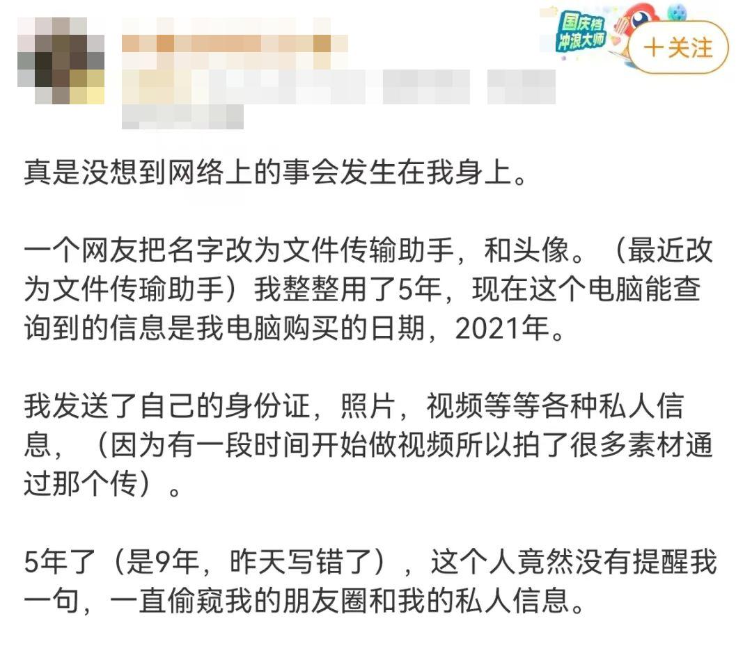 該女子表示,自己平時會發送身份證、照片、視頻等各種私人信息給這個“文件傳輸助手”,但9年來此人都沒有提醒過自己,該女子認爲此人是在偷窺自己的朋友圈和私人信息。