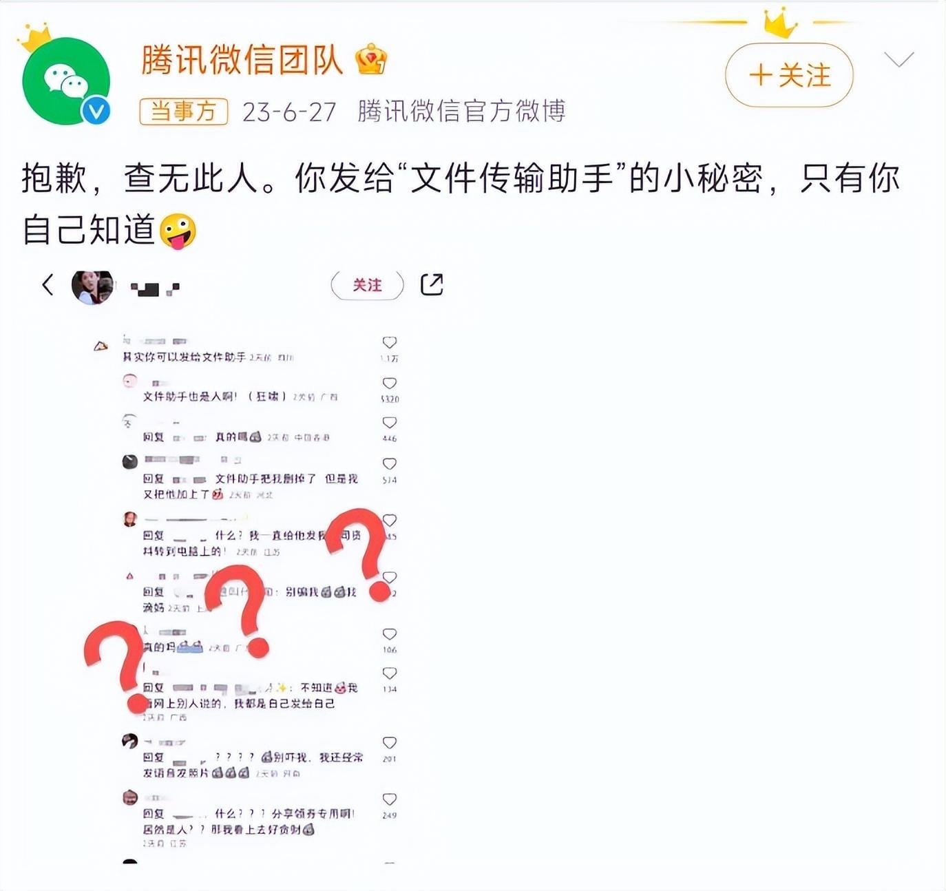 2023年6月27日,“騰訊微信”官方微博回應稱:抱歉,查無此人。你發給“文件傳輸助手”的小祕密,只有你自己知道。