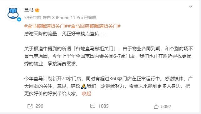 有報道稱,多地盒馬近期傳出撤櫃關門的消息,相關話題登上微博熱搜。3月6日,盒馬官方微博發佈聲明表示,由於物業合同到期,和個別商場不景氣等原因,今年上半年盒馬鮮生正常進行尾部門店汰換,在全國範圍內關閉6-7家門店,並在附近尋找更優秀的物業,承接消費需求。同時,超過360家門店正常運行中。盒馬還表示,今年盒馬鮮生計劃新開70家門店,年內盒馬鮮生門店數有望突破400家。微信編輯:何夕還原事實,洞悉真相。歡迎關注,留言舉報!