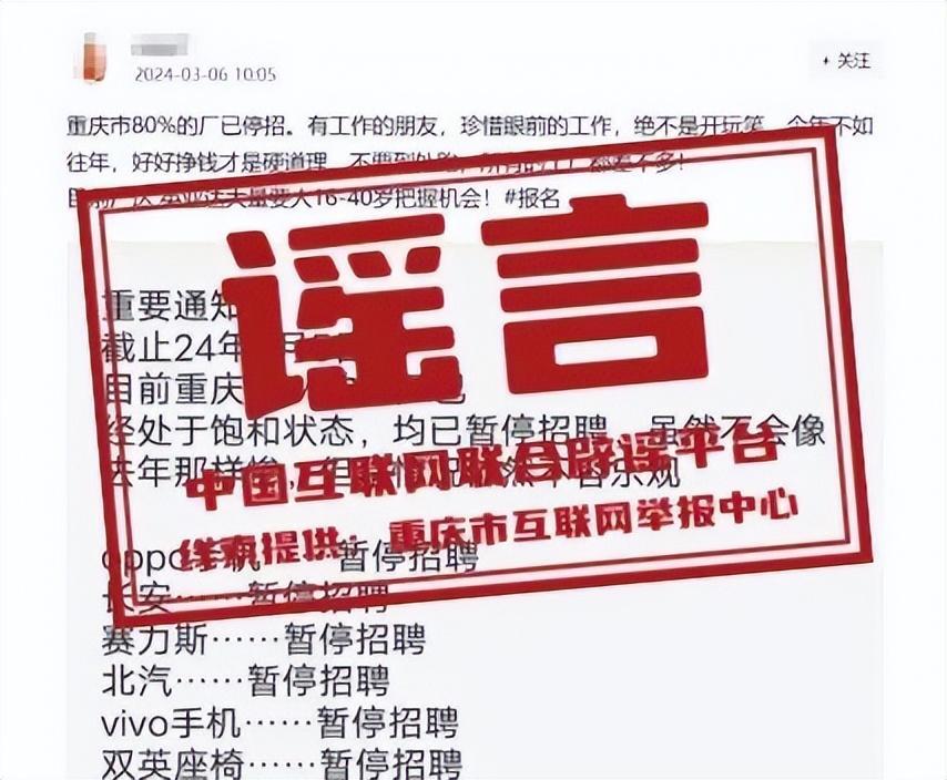 真相:近日,有網民在某網絡平臺上發佈信息:“目前重慶市80%的廠已處於飽和狀態,均已暫停招聘”,引發關注。經重慶市人力資源和社會保障局覈實,網傳信息爲謠言。網民發佈的所謂工廠停招信息中涉及的10餘家企業,並未暫停招聘。例如,賽力斯公司除個別崗位招滿不再招人外,其他未招滿的崗位還會繼續招聘;長安公司招聘工人以校招爲主,社招爲輔,前幾天還在面向學校春招。(來源:“重慶闢謠”微信公衆號)