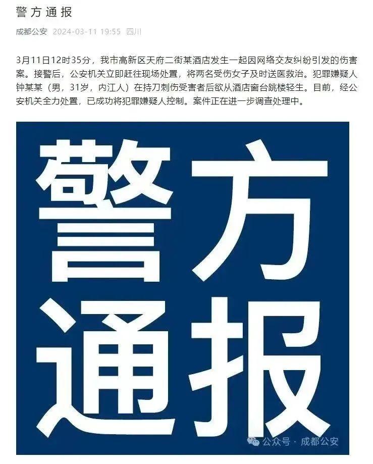 對此,成都公安於3月11日通過微信公衆號發佈“警方通報”稱,我市高新區天府二街某酒店發生一起因網絡交友糾紛引發的傷害案。接警後,公安機關立即趕往現場處置,將兩名受傷女子及時送醫救治。犯罪嫌疑人鍾某某(男,31歲,內江人)在持刀刺傷受害者後欲從酒店窗臺跳樓輕生。目前,經公安機關全力處置,已成功將犯罪嫌疑人控制。案件正在進一步調查處理中。