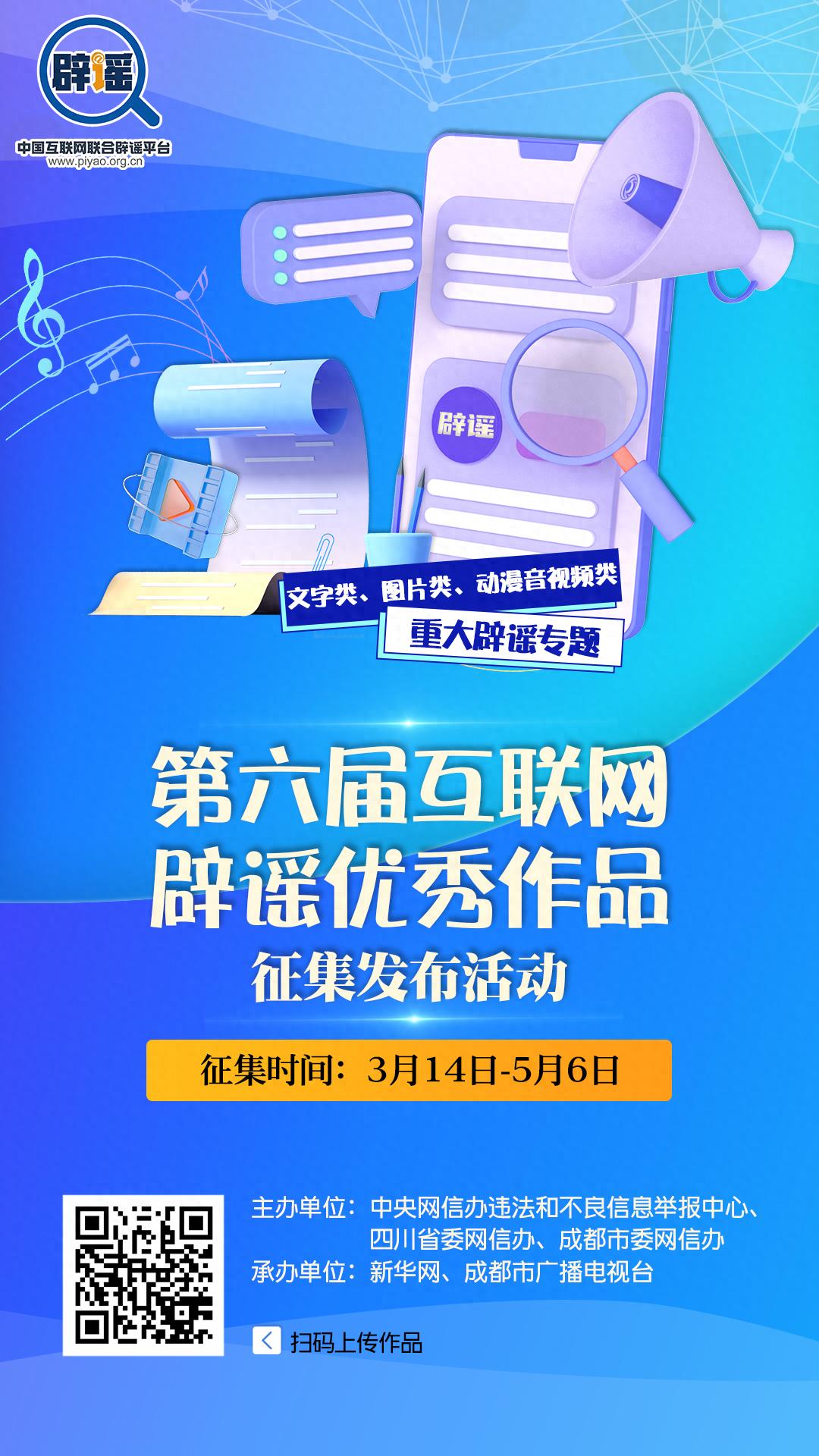 爲進一步深化網絡聯動闢謠工作,鼓勵引導社會各方面力量積極參與網絡闢謠作品創作與傳播,提升全民識謠辨謠能力,共同構建清朗網絡家園,中央網信辦違法和不良信息舉報中心與四川省委網信辦、成都市委網信辦聯合開展第六屆互聯網闢謠優秀作品徵集活動。現面向社會徵集網絡闢謠作品。