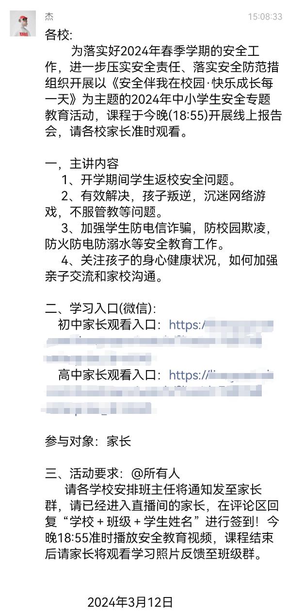 近日,有網民舉報稱接到以“應急管理”名義發佈的信息,3月14日將線上開展2024年高中小學生安全教育工作,並附有相關學習入口的直播鏈接。