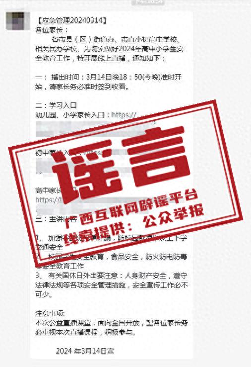 經廣西互聯網闢謠平臺查證,該信息爲虛假謠言,且近期北海曾出現類似謠言。據“廣西消防”官方公衆號發文稱,3月12日,北海市合浦縣實驗學校負責安全工作的老師向北海消防舉報,表示其在工作中接到了一個帶着本地口音自稱“合浦消防隊的陳杰參謀”打來的電話,要求添加微信,隨後發來一個無落款、無印章的《通知》,內容爲:於12日晚組織開展2024年中小學生消防安全專題直播,結尾處附了初中生和高中生入口的兩個直播鏈接,並要求吳老師發動學校班主任將通知發至家長羣,請已經進入直播間的家長,在評論區回覆“學校+班級+學生姓名”進行簽到。