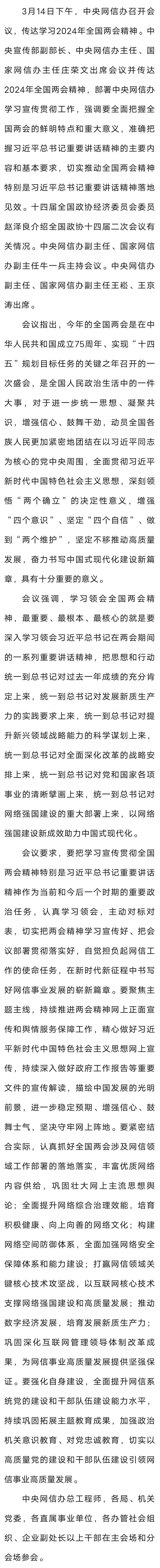中央網信辦召開會議傳達學習2024年全國兩會精神