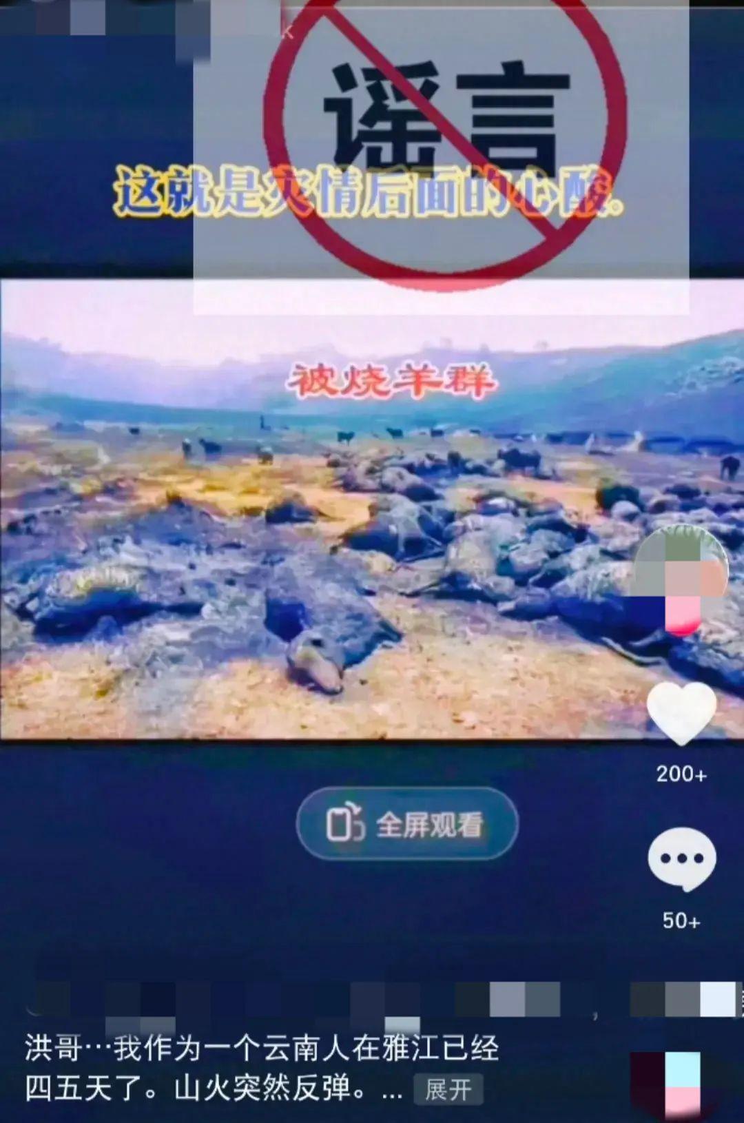 經與前方森林草原防火指揮部覈實,網傳視頻內容疑是:某國南部邊境城市拉洪克拉附近的達爾紐斯山林大火中被燒死的羊羣。雅江山火火場山勢陡峭,與視頻裏火場場景不符。此視頻系炒作,嫁接謠言。