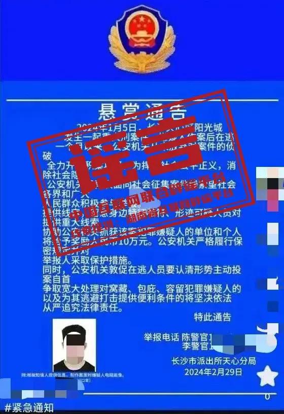謠 言 湖南省長沙市天心區發生重大刑案,警方發佈懸賞通告?