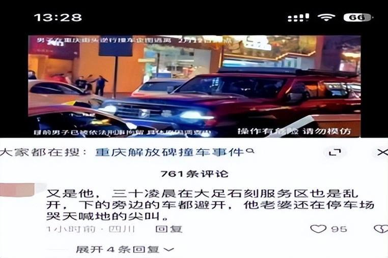 近日,我市一網民在某網絡平臺針對解放碑事件造謠稱“又是他,三十凌晨在大足石刻服務區也是亂開,下的旁邊的車都避開,他老婆還在停車場哭天喊地的尖叫”。