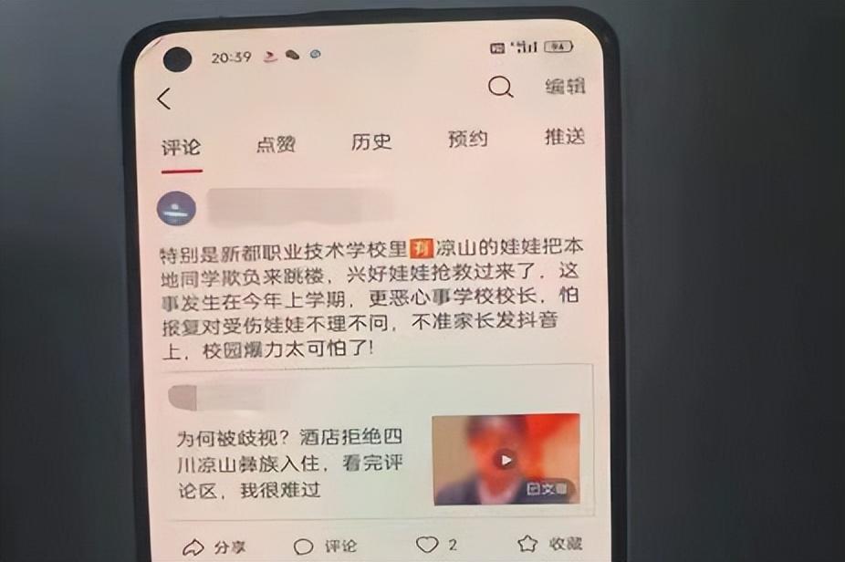 近日,我市一網民在某網絡平臺上標題爲“爲何被歧視?酒店拒絕四川涼山彝族入住,看完評論區,我很難過”的文章評論區中,散佈虛假信息:“特別是新都職業技術學校裏有涼山的娃娃把本地同學欺負來跳樓,興好娃娃搶救過來了,這事發生在今年上學期,更噁心事學校校長,怕報復對受傷娃娃不理不問,不準家長髮抖音上,校園暴力太可怕了!”的相關言論。