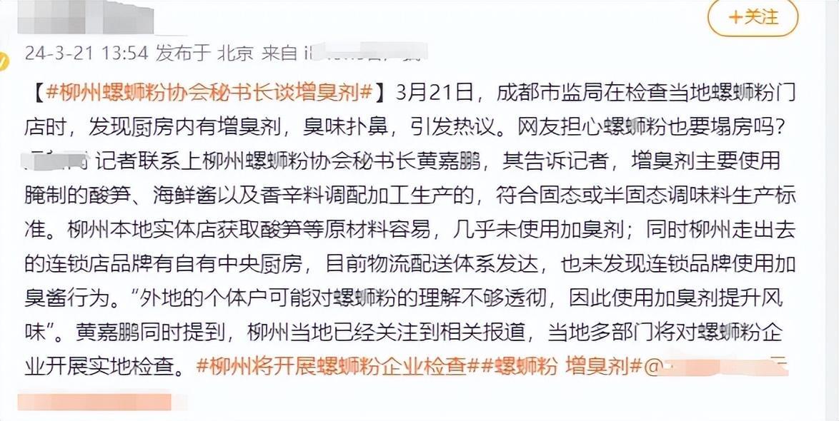 3月21日,柳州螺螄粉協會祕書長黃嘉鵬針對“增臭劑“進行了回應。