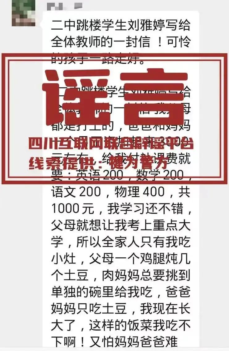 連日來,一則四川犍爲“二中跳樓學生劉雅婷寫給全體教師的一封信!可憐的孩子一路走好”的消息在網絡上傳播,引發關注。該消息以“二中跳樓學生劉雅婷”自居,稱父母都是打工的,生活拮据,補課費給他們家庭帶來了巨大的壓力,於是選擇跳樓自殺。