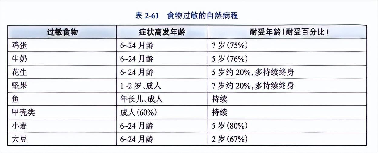- 堅果、花生、魚和貝類通常到成年期仍持續存在,僅少數可產生耐受。