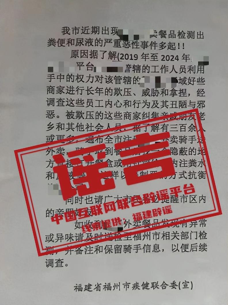謠 言 “福建省福州市疾健聯合委”發文稱“某外賣平臺餐品檢出糞便和尿液”?