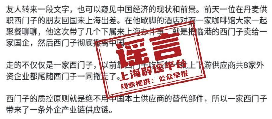 這條謠言的發佈者稱,一位西門子員工來上海辦事,要把臨港的西門子賣給一家國企,西門子徹底撤離中國,上下游的8家外資企業也都尾隨一同撤走了。