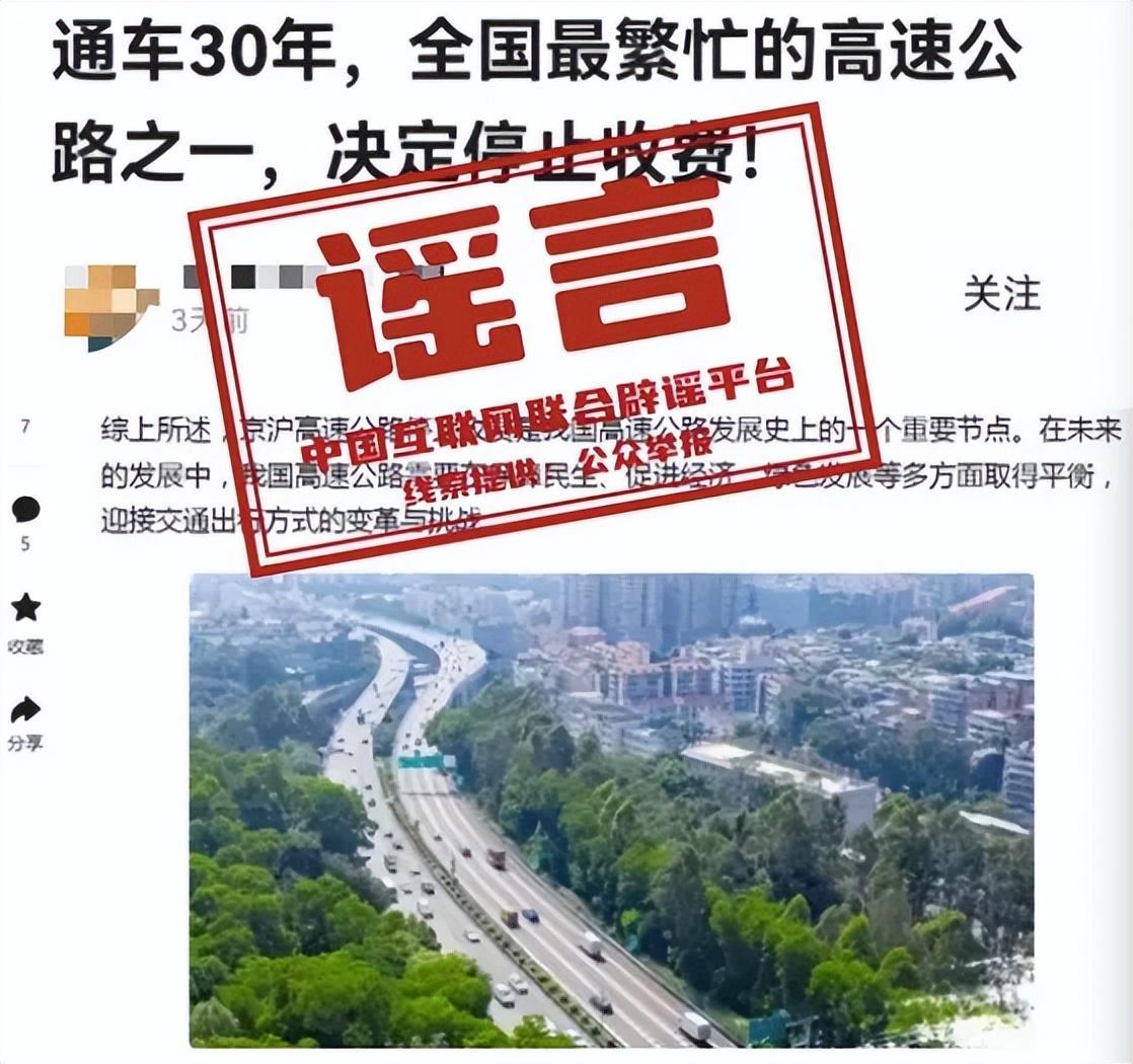 真相:近日,有網民在網絡平臺發文“通車30年,全國最繁忙的高速公路之一,決定停止收費!”,宣稱“京滬高速公路停止收費”。經中國互聯網聯合闢謠平臺向有關主管部門覈實查證,京滬高速公路並未終止收費,該文章內容屬不實信息。文中所使用的高速公路照片實際上是在“廣州北環高速公路停止收費”新聞圖片基礎上編輯剪裁而成,相關內容虛構事實,擾亂公共秩序、誤導羣衆。(來源:中國互聯網聯合闢謠平臺)