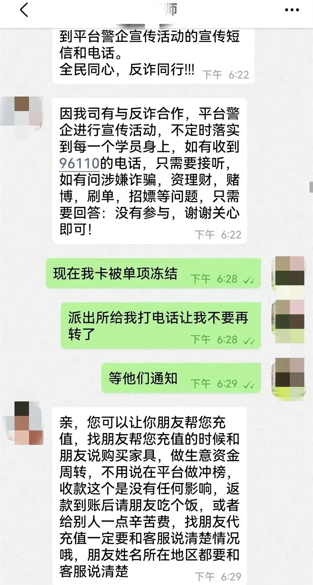 “我們平臺和反詐中心有合作,如收到96110的電話,只需要接聽,如對方詢問投資理財、賭博、刷單等問題,只需要回答:沒有參與,謝謝關心即可!”在聽信了“客服”的話後,汪女士即便收到了數個成都市公安局龍泉驛區分局北幹道派出所打來的反詐勸阻電話,她依舊堅定地對民警表示自己沒有刷單。但等她醒悟過來後發現,自己投入的12萬元已經“打了水漂”。