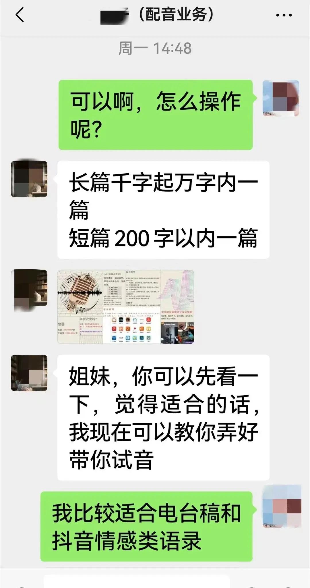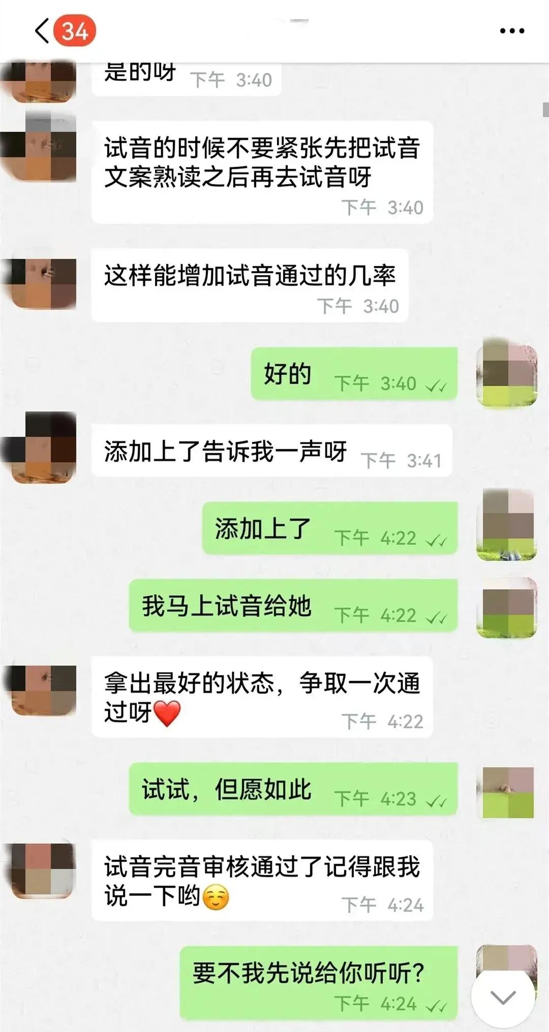不久前,汪女士在一個配音微信羣裏添加了一名自稱可以兼職錄音賺錢的網友“小英子”,汪女士本來也對配音很感興趣,便按照對方要求進行了試音,很快,汪女士通過了“面試”。在正式開始配音工作時,“小英子”讓汪女士添加了一名配音老師,隨後,陳老師發來消息讓汪女士練習配音技巧,並表示後續會分配配音任務。