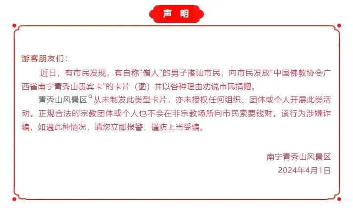 4月1日,南寧青秀山風景區發佈聲明表示,青秀山風景區從未制發此類型卡片,亦未授權任何組織、團體或個人開展此類活動。