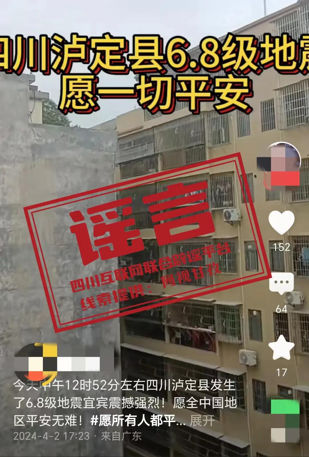 4月2日,有網民發佈視頻稱:“今天中午,12時52分左右四川瀘定縣發生6.8級地震,宜賓震感強烈!”