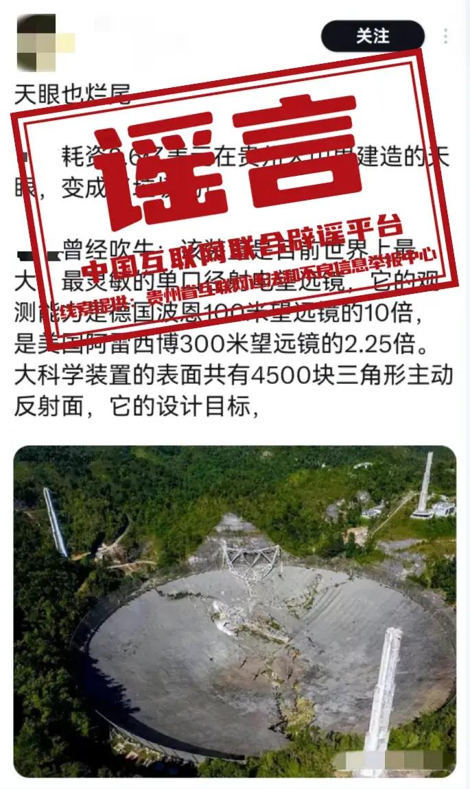真相:近日,海外社交平臺有網民發佈一張圖片,聲稱“耗資2.6億美元在貴州大山裏建造的天眼,變成了垃圾場!”對此,“貴州闢謠”官方微信公衆號發佈消息稱,網傳說法爲謠傳,網傳圖片實爲美國波多黎各的阿雷西博天文臺(Arecibo Observatory)於2020年12月發生徹底坍塌的畫面,該天文臺主要的觀測裝置爲阿雷西博射電望遠鏡。事實上,這並非“中國天眼”第一次“被坍塌”,2020年阿雷西博望遠鏡第一次出現嚴重損壞之際,網絡中就曾出現過類似謠言。
