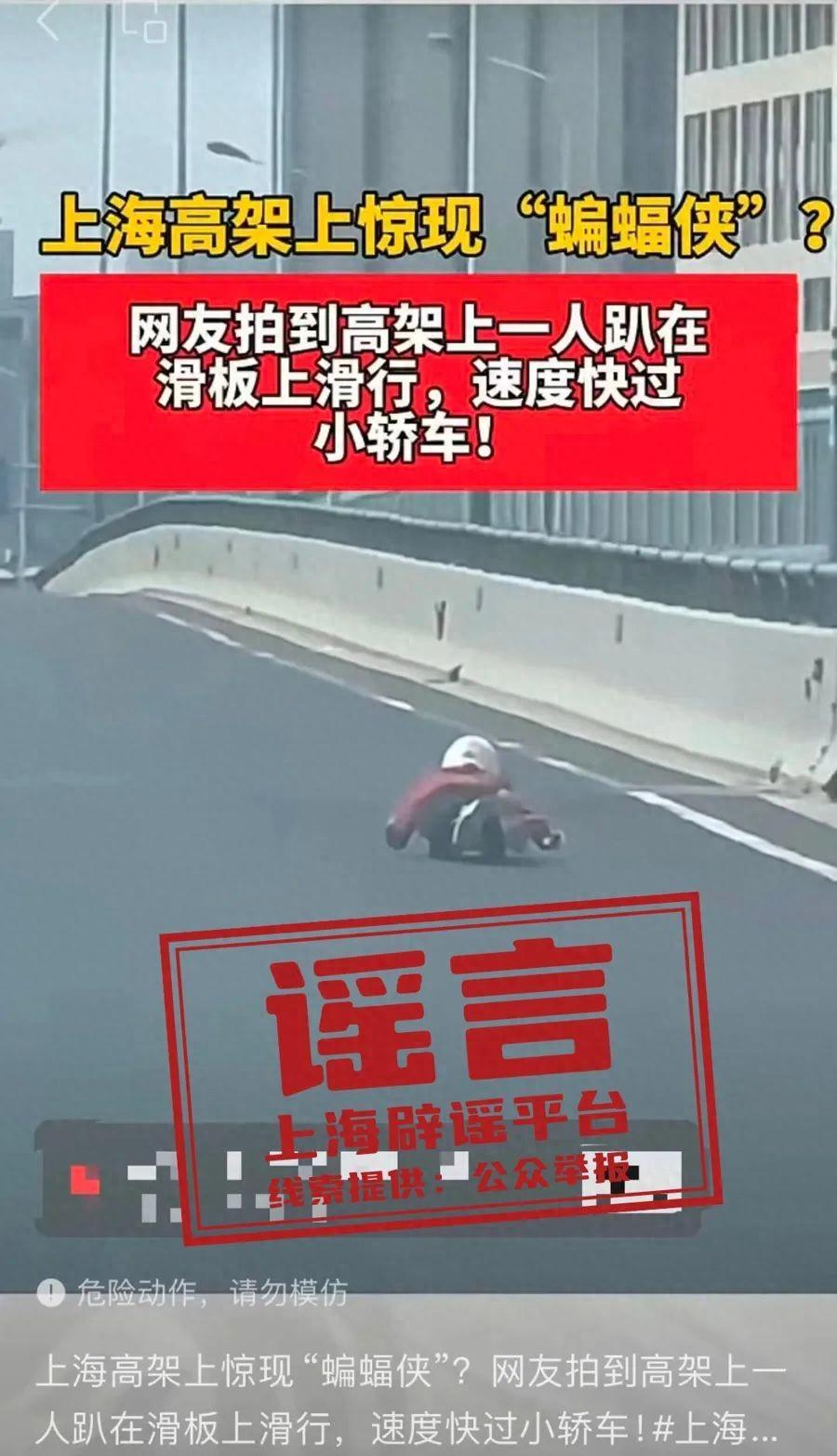 4月11日,一段視頻在網絡流傳:一名男子頭戴頭盔俯臥在滑板車上,在高架路上的車流之中穿梭前行,速度甚至超過了旁邊的汽車。視頻稱此事發生於上海,還將該男子行爲形容爲“蝙蝠俠”。經相關部門介紹,此事並非發生在上海,而是濟南,當地交警已在調查處理。