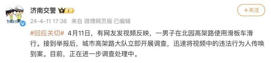上海市公安局交警總隊11日覈實網傳視頻後表示,上海高架並未發生此事。11日下午5時36分,濟南交警發佈微博通報了該事件的情況,微博稱:“4月11日,有網友發視頻反映,一男子在北園高架路使用滑板車滑行。接到舉報後,城市高架路大隊立即開展調查,迅速將視頻中的違法行爲人傳喚到案。目前,正在進一步調查處理中。”
