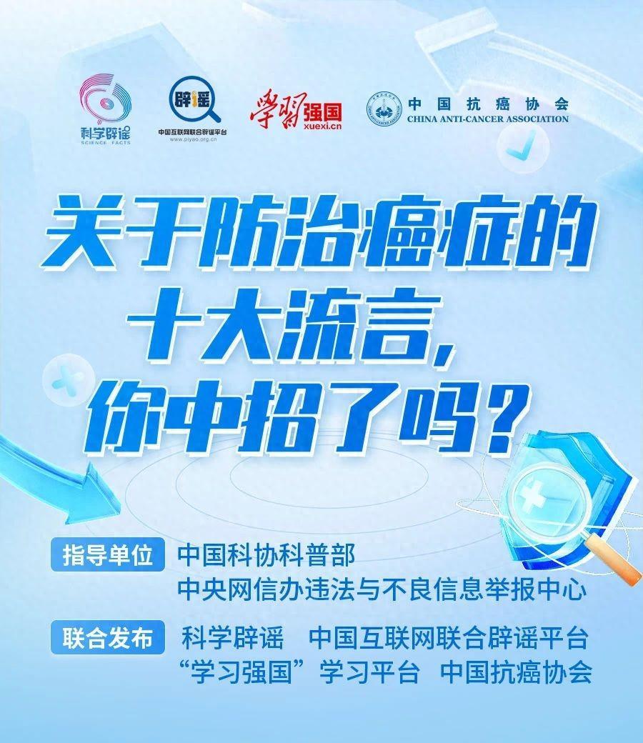 今天,科學闢謠聯合中國互聯網聯合闢謠平臺、“學習強國”學習平臺、中國抗癌協會,針對 10 個廣爲流傳的有關“防治癌症”的流言進行解讀,快看看你中招了沒?