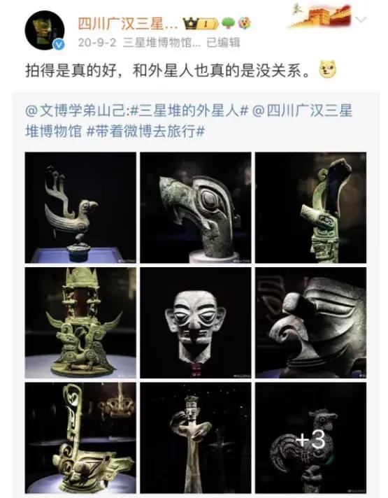 對此,官方也曾多次闢謠:2020年9月,三星堆官方微博@四川廣漢三星堆博物館評論一組三星堆文物便稱,“拍得是真的好,和外星人也真的沒關係。”