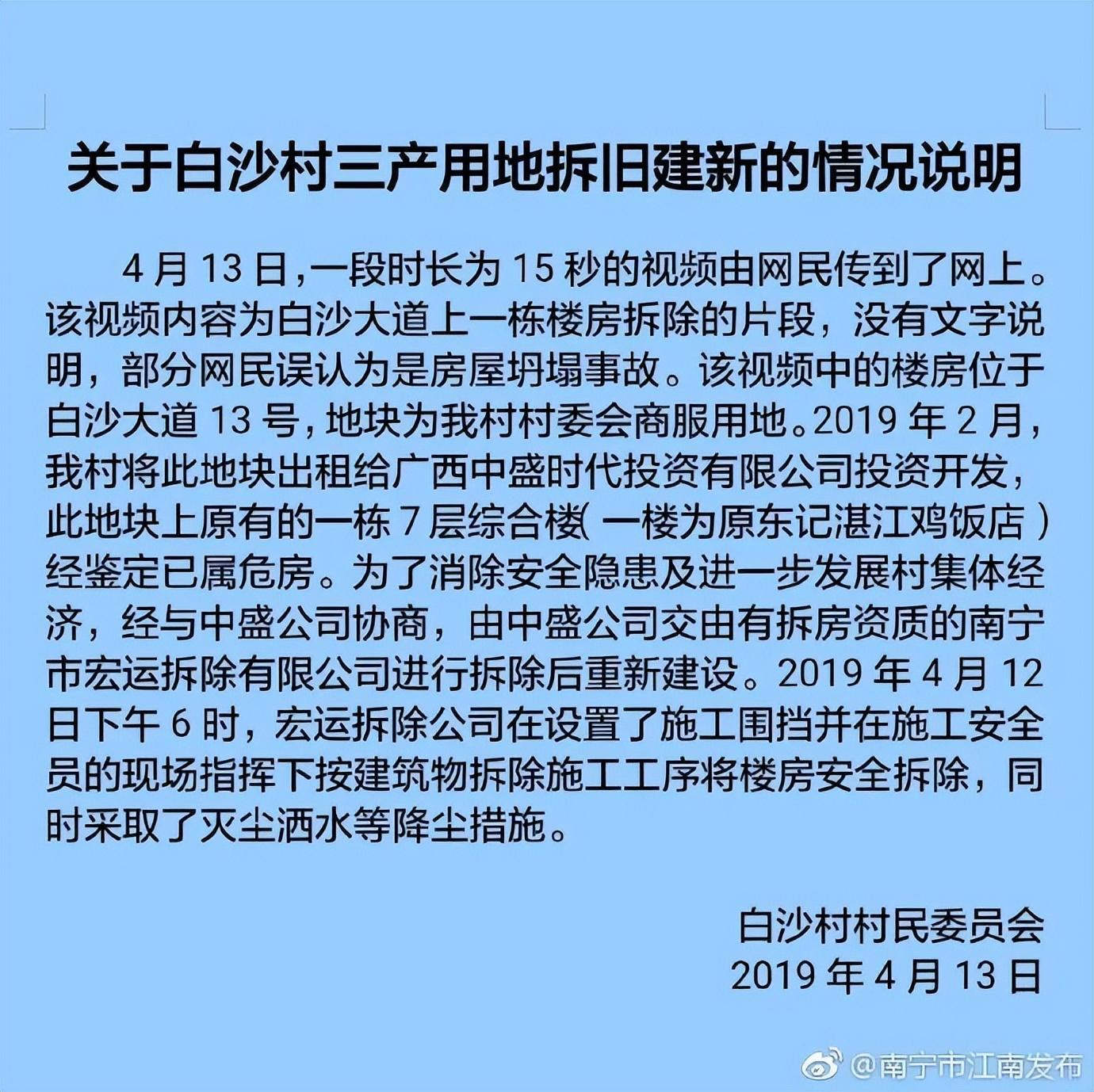 據悉,該視頻中的樓房位於南寧市白沙大道13號,屬白沙村村委的三產(商業服務)用地。2019年2月,該地塊被出租給廣西某投資有限公司投資進行開發,在此地塊上原有的一棟7層綜合樓(原爲東記湛江雞飯店)已是危房,該公司交給有拆房資質的南寧市宏運拆除有限公司進行拆除。