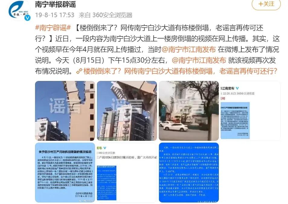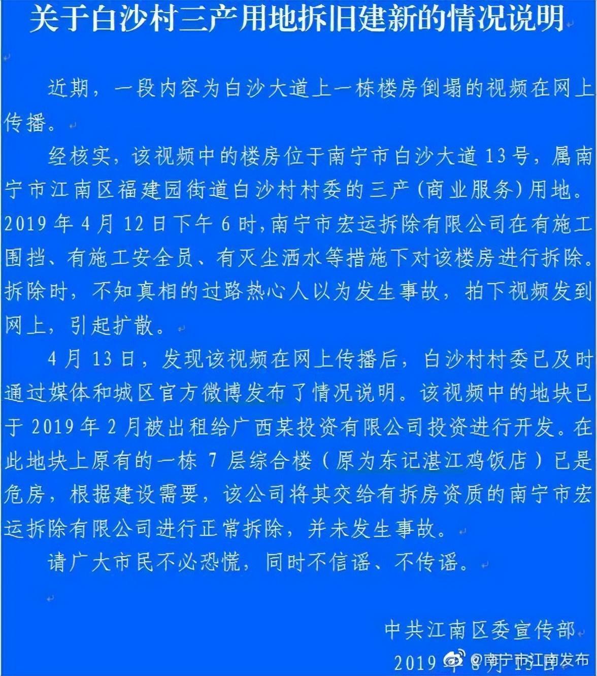 2019年,南寧互聯網舉報·闢謠平臺也對該謠言進行闢謠。根據中共江南區委宣傳部、白沙村村民委員會分別於2019年4月13日、8月15日發佈的情況說明,該網傳視頻拍攝的“樓房倒塌”實爲2019年4月白沙村一危房正在進行安全拆除。