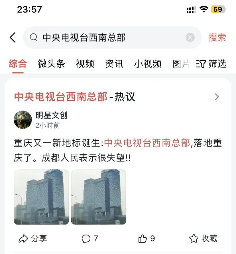 近期,網民“明星文創”在某網絡平臺發佈文章,標題爲《中央電視臺西南總部正式落地重慶》。文章內容稱:“重慶又一新地標誕生:中央電視臺西南總部,落地重慶了。成都人民表示很失望!”經調查,文章內容涉及“中央電視臺西南總部正式落地重慶”等內容爲不實信息。