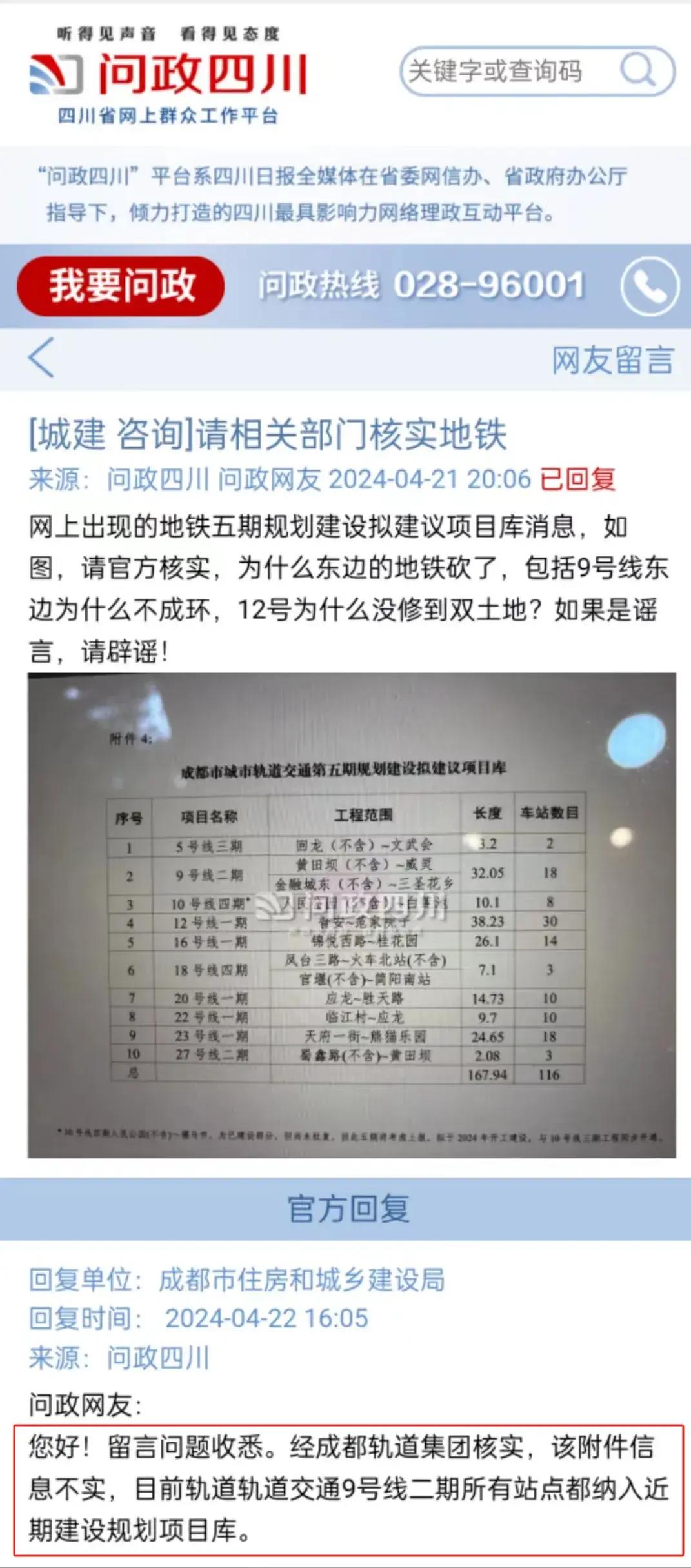對此,成都市住房和城鄉建設局於4月22日在“問政四川”官方網站上回復消息,稱該附件信息不實,目前軌道交通9號線二期所有站點都納入近期建設規劃項目庫。