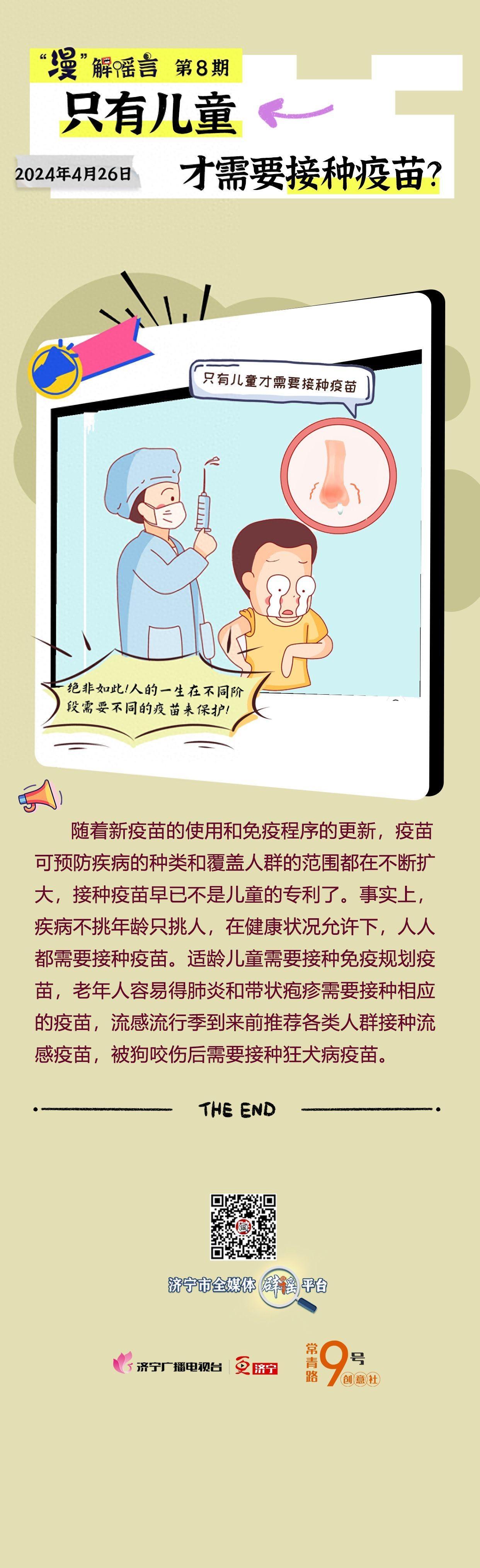 濟寧市全媒體闢謠平臺4月26日訊 只有兒童才需要接種疫苗?其實,這是一種誤區,人的一生在不同階段需要不同的疫苗來保護。