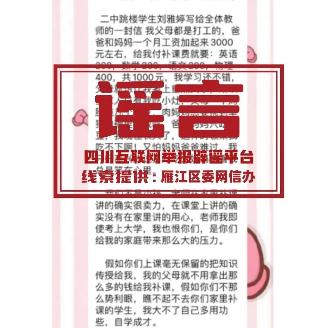 近日,資陽市雁江區部分微信羣有網友在轉發“二中跳樓學生劉雅婷寫給全體教師的一封信,可憐的孩子一路走好”信息,該信息沒有標註時間、地點、人物,導致廣大網友誤會,雁江二中沉重“背鍋”。