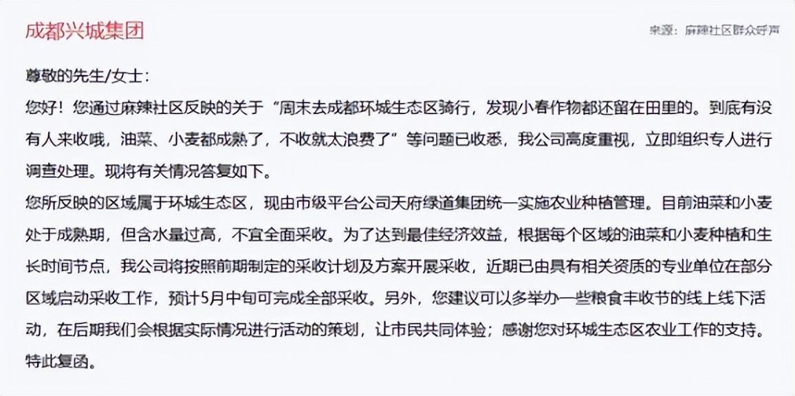 收到留言後,成都興城集團回應稱,目前環城生態區油菜和小麥正處於成熟期,但由於含水量過高,不宜全面採收。