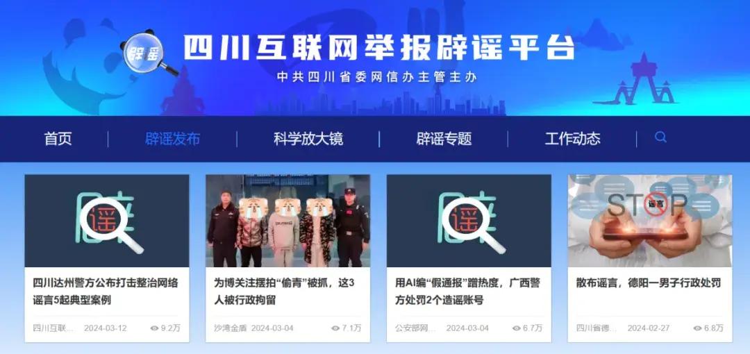 如,機制創新。四川創新“1+5+N” 網絡闢謠聯動機制,建強四川互聯網舉報闢謠平臺“樹幹”,壯大5家粉絲總量過億的省內重點媒體“樹枝”,發揮40家省直部門政務新媒體、21個市(州)網信闢謠平臺和新聞網站、185個縣級融媒體中心等“樹葉”力量,最大限度放大權威闢謠聲量。截至目前,僅平臺端,已發佈權威闢謠內容12000餘條,原創闢謠稿件2000餘條。其中,36條闢謠稿件閱讀量過億,閱讀量100萬+的稿件達130條,在全網發出了具有四川特色的“闢謠之聲”。