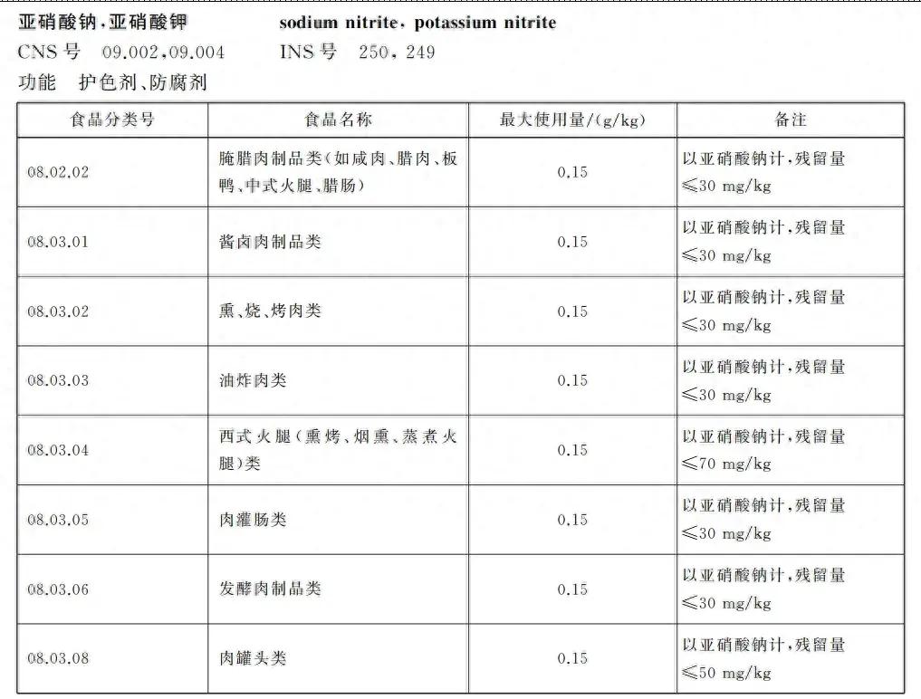 其實,很多食物中都存在亞硝酸鹽,主動添加的有加工肉製品,比如烤腸、午餐肉等;天然含有或原料自帶的比如綠葉菜、嬰兒米粉等。肉製品的亞硝酸鹽含量,根據食品添加劑 GB2760 的國標要求,大多數種類只要每千克在 30mg 以下就算是合格的。