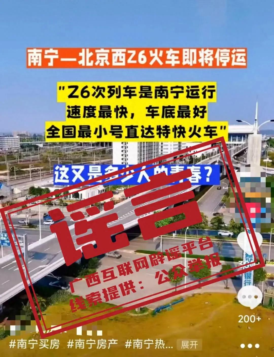 經廣西互聯網闢謠平臺向中國鐵路南寧局集團有限公司證實,鐵路部門未計劃安排南寧至北京西Z5/6次列車停運,亦從未發佈該列車即將停運的消息,相關自媒體賬號發佈的信息爲謠言信息。