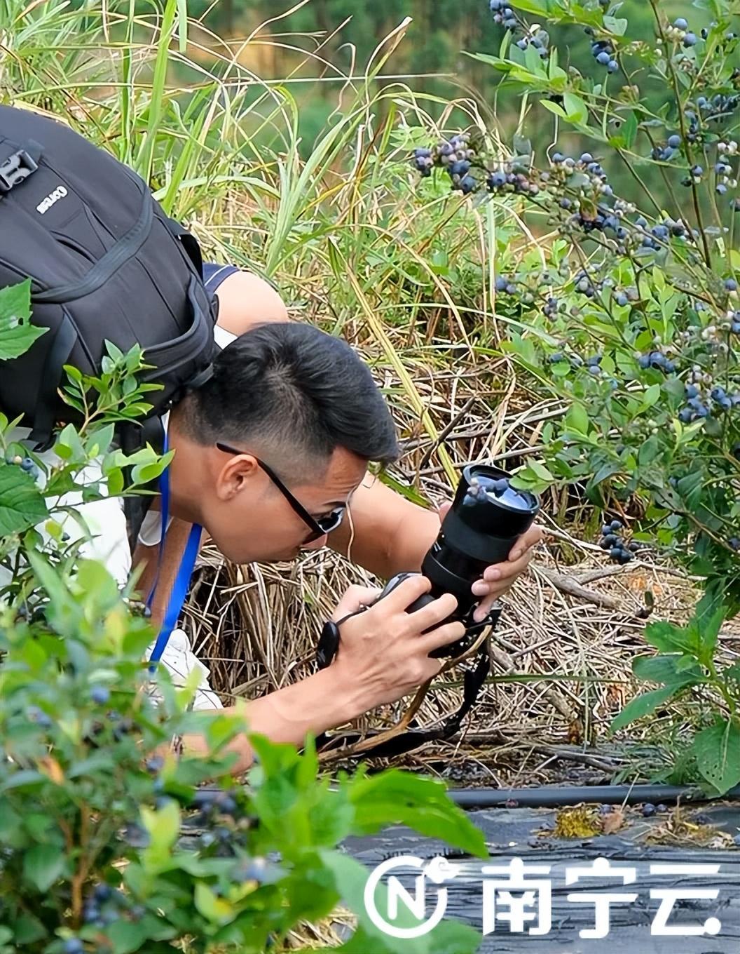 網絡名人在採摘藍莓的同時,運用各種攝影設備,爲品牌推廣和鄉村旅遊招引流量、匯聚人氣。記者 遊智超 攝