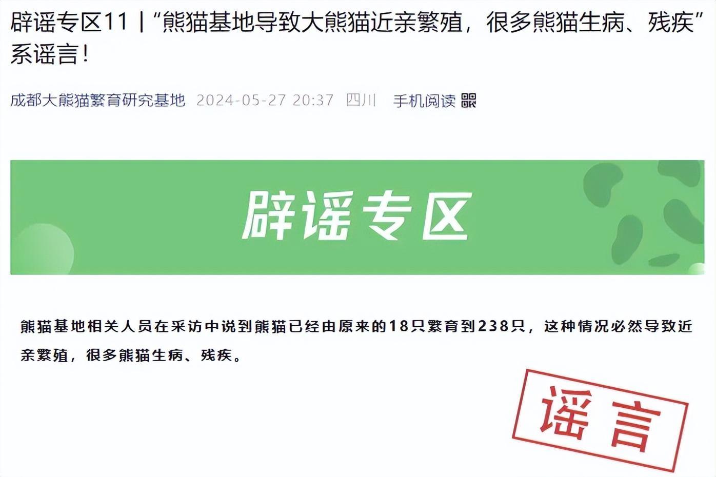 近日,有網傳信息稱,成都熊貓基地相關人員在採訪中說到熊貓已經由原來的18只繁育到238只,這種情況必然導致近親繁殖,很多熊貓生病、殘疾。對此,5月27日成都大熊貓繁育研究基地通過微信公衆號發佈了相關闢謠信息。