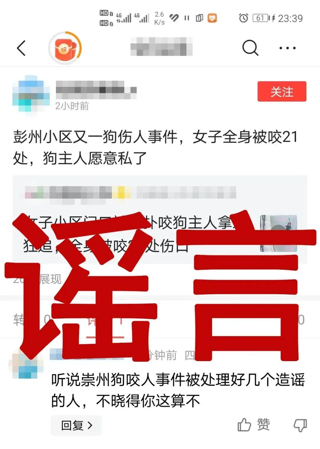 2024年4月2日,網友宋某在“今日頭條”上刷到一個視頻,內容是一女子在小區內被狗咬傷。宋某爲博取眼球,吸引流量和增漲粉絲,在轉發該視頻時配文“彭州小區又一狗傷人事件,女子全身被咬21處傷口,狗主人願意私了”。宋某的視頻發佈後,引起彭州市政府高度重視,組織彭州市公安局和各部門、各鎮以及街道辦緊急覈實摸排。經調查,事件並非發生在四川省,宋某所發文字系自行編造。