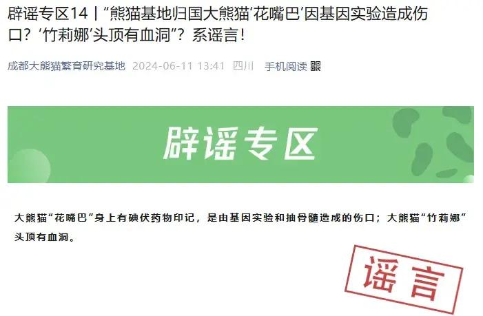近日,有網傳信息稱,“大熊貓‘花嘴巴’身上有碘伏藥物印記,是由基因實驗和抽骨髓造成的傷口;大熊貓‘竹莉娜’頭頂有血洞。”對此,6月11日成都大熊貓繁育研究基地在微信公衆號上發佈了相關闢謠信息。