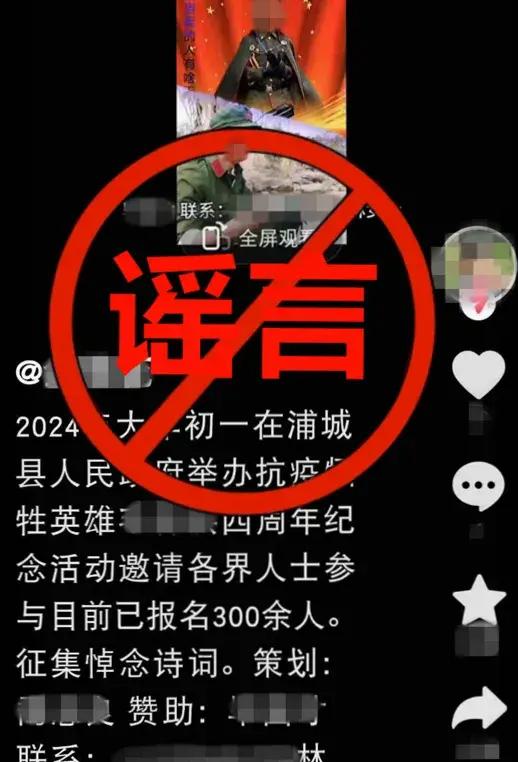 2024年3月29日,浦城林某某在某短視頻平臺上發佈多條視頻,內容爲“浦城縣人民政府計劃2024年大年初一舉辦抗疫犧牲人員相關紀念活動”,引起了網民的關注和議論。經公安機關覈查,浦城縣未曾舉辦過此類活動,該信息系謠言。