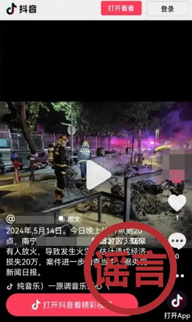 2024年5月14日,南寧網民韋某在抖音發佈圖文信息稱“南寧市某小學宿舍區疑似有人放火導致火災,估計造成經濟損失20萬元”,引發網民關注。